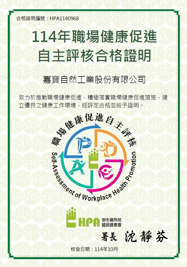 積極落實職場健康促進,建立優良健康工作環境,通過衛生部國民健康署職場健康促進自主評核合格。