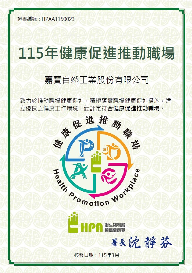 嘉宝符合劳动部职业安全卫生署规定之职业安全卫生法规,获核发企业识别码,日后出厂之传统砂轮产品均将标示TS安全标示图示以及嘉宝识别码TD040003。